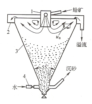 分泥斗又称圆锥分级机,是一种简单的分级、脱泥及浓缩用设备。它的外形为一倒立的圆锥。在液面中心设置给矿圆筒,圆筒底缘没入液面以下若干深度。矿浆沿切线方向向给入中心圆筒,经缓冲后由底缘流出。流出的矿浆呈放射状向周边溢流堰流出。在这一过程中,沉降速度大于液流上升分速度的粗颗粒将沉在槽内,并经底部沉砂排出。细颗粒随表层矿浆进到溢流槽内。给矿粒度一般小于2mm。分级粒度为75μm或更细些。
