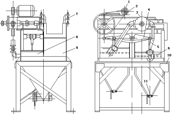1-电动机; 2-传动部分; 3-分水器; 4-摇臂; 5-连杆; 6-胶隔膜; 7-跳汰室;8-隔膜室; 9-跳汰室; 10-机架; 11-排矿活栓