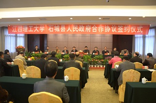 会上理工大学书记熊正明与我县县长鲍峰庭签订《石城矿山机械产业发展的合作协议书》、《矿山机械技术研发中心协议书》合作协议,由赣东矿机总经理与江西理工大学教授签订“新产品开发合作协议”。