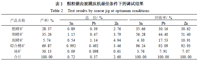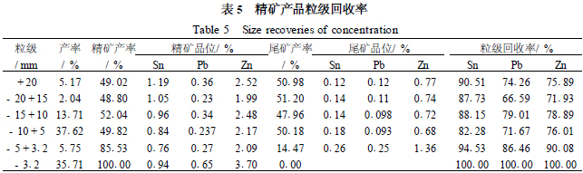 (1)大厂92#矿体矿石20~0mm全粒级入选,锯齿波跳汰机预选抛废率为30.45%,锡、铅、锌金属回收率分别为93.48%、90.38%、90.75%。
