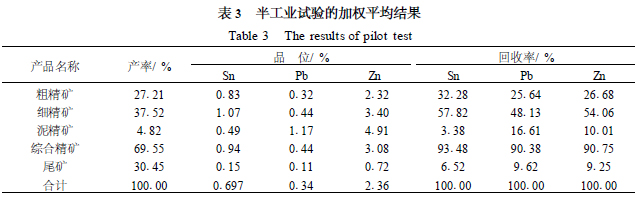 由表2得知,抛废率为30.13%时,锡、铅、锌金属回收率分别为96.24%、92.09%、92.93%,尾矿品位分别为Sn0.09%、Pb0.098%、Zn0.61%。