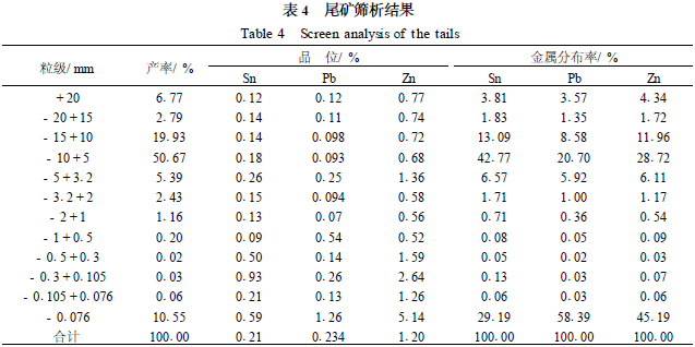尾矿筛析样为未经脱泥的锯齿波跳汰机尾矿,筛析结果见表4 。筛析结果表明: ①尾矿中只有-0.5 mm 粒级具有回收价值,而-0.076mm
